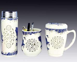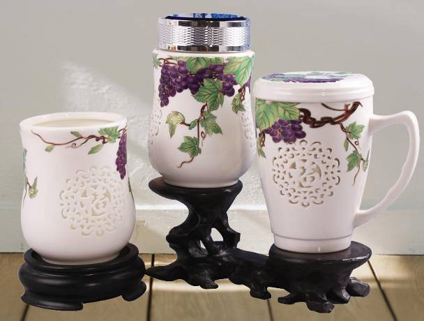 內(nèi)外雙層瓷坯,外部鏤雕出有規(guī) 則的透空孔,隔熱防燙又美觀。雕出福字 型,寓意吉祥,福祿滿堂。