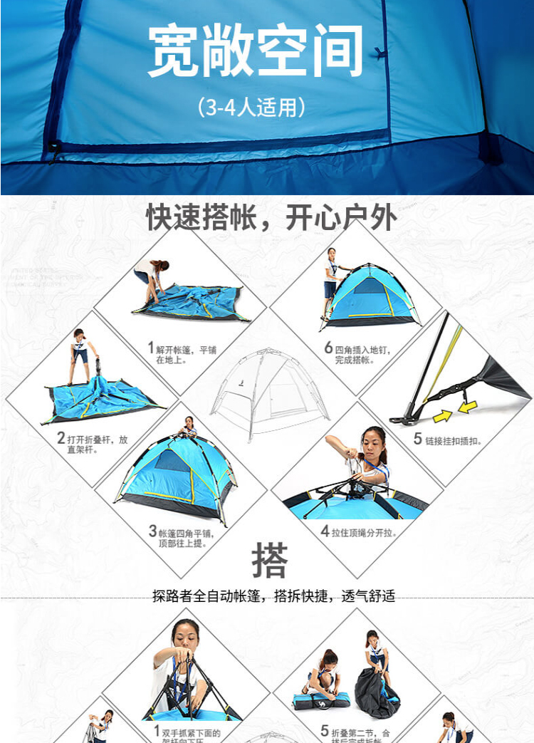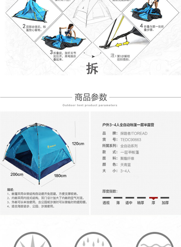 • 探路者TOREAD自動(dòng)速開免搭建帳篷 防雨透氣 戶外通款三人一層半帳篷