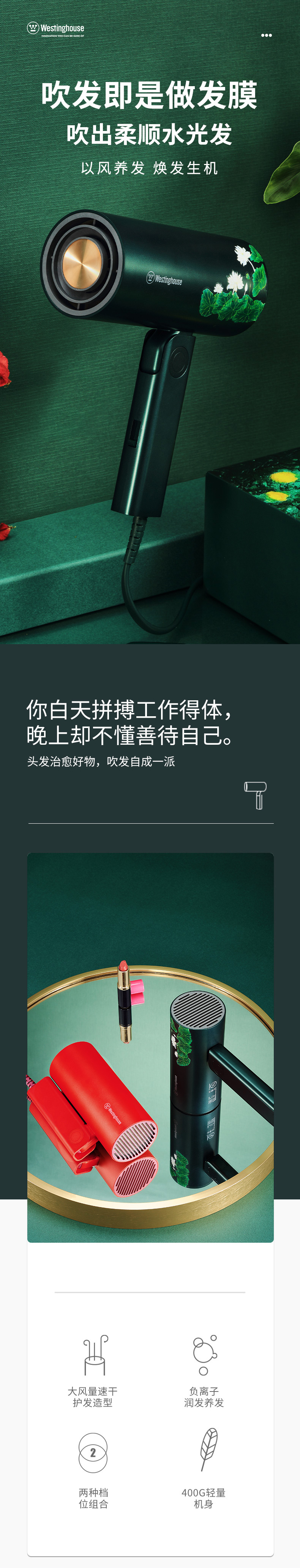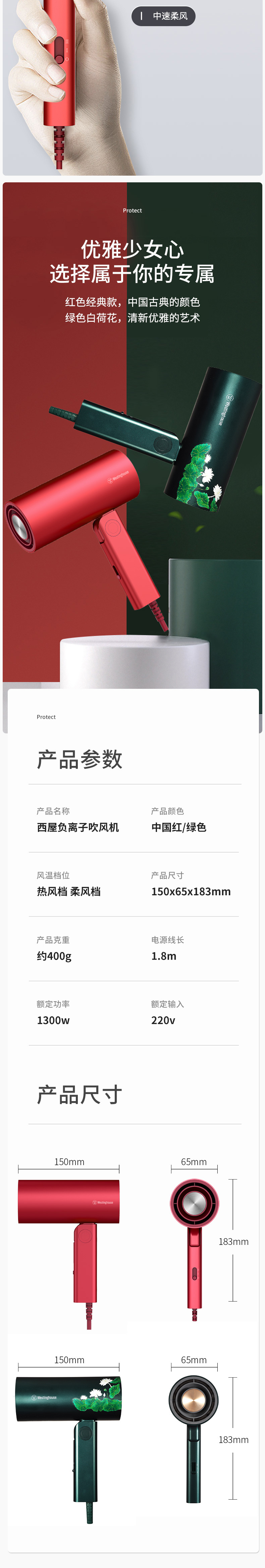 • 西屋(Westinghouse) 吹風(fēng)機(jī)網(wǎng)紅款宿舍家用負(fù)離子大功率便攜式電吹風(fēng)男女生 胭脂紅