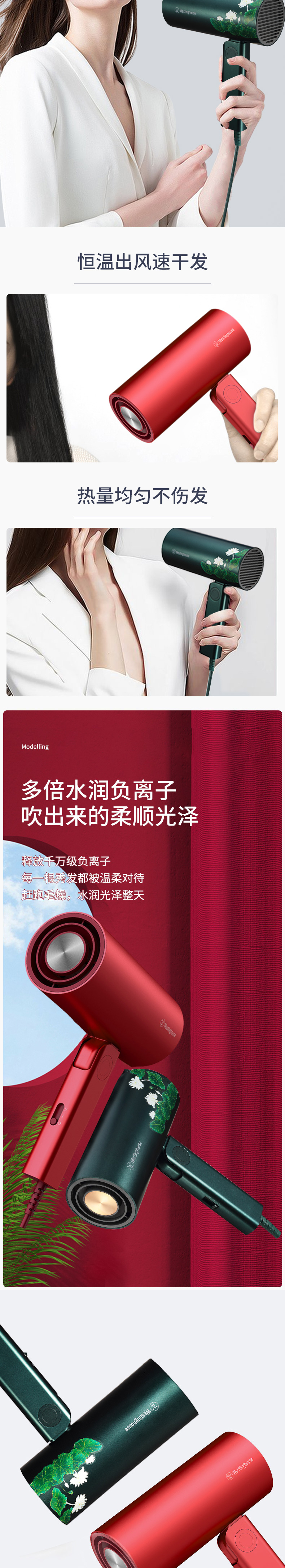 西屋(Westinghouse) 吹風(fēng)機(jī)網(wǎng)紅款宿舍家用負(fù)離子大功率便攜式電吹風(fēng)男女生 胭脂紅