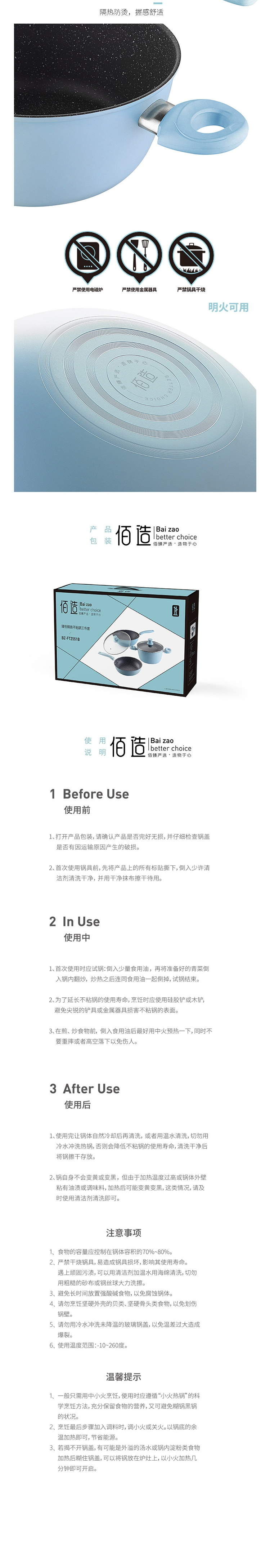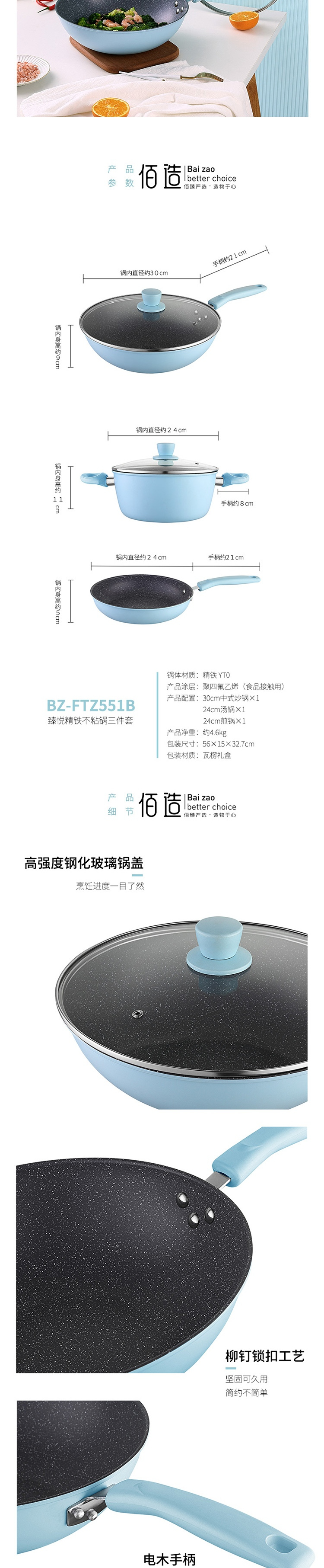 佰造臻悅精鐵不粘鍋三件套BZ-FTZ551B馬卡龍色清新時(shí)尚白領(lǐng)
