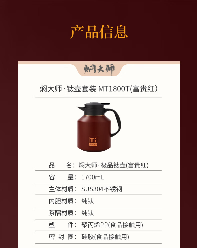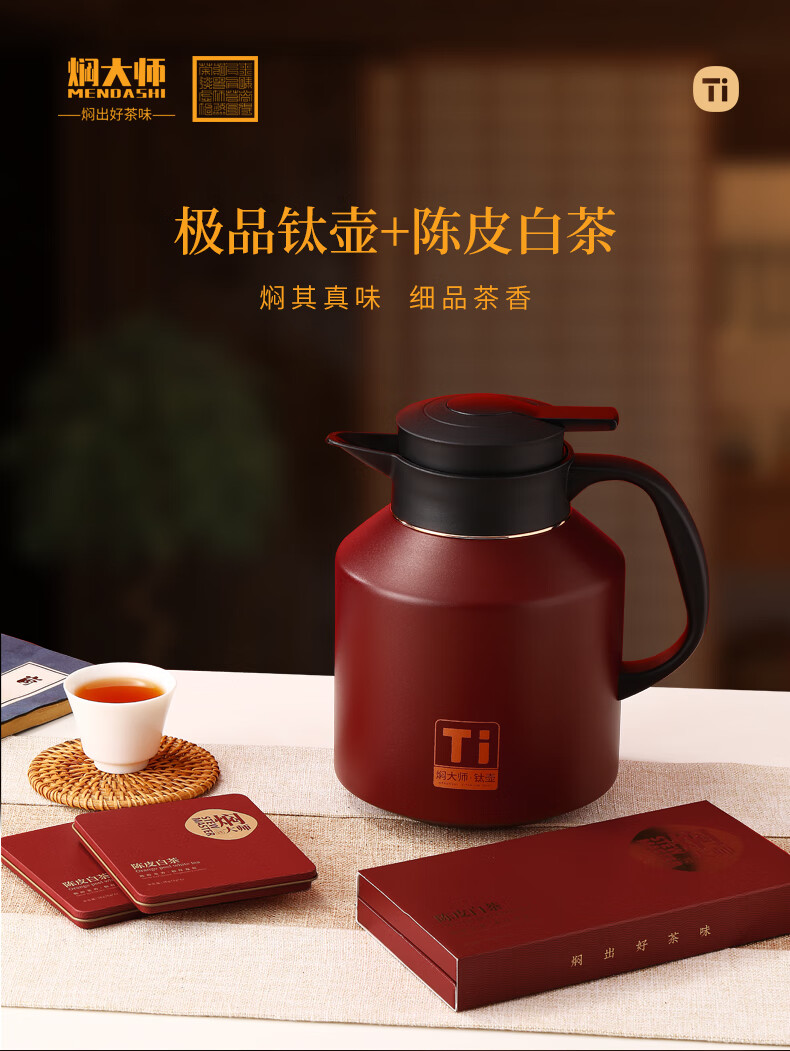 首頁 > 全部禮品 > 家居家電 > 保溫壺 > 燜大師(MENDASHI) 純鈦燜茶壺富貴紅商務(wù)辦公燜泡壺陳皮白茶燜壺套裝純鈦內(nèi)膽茶隔