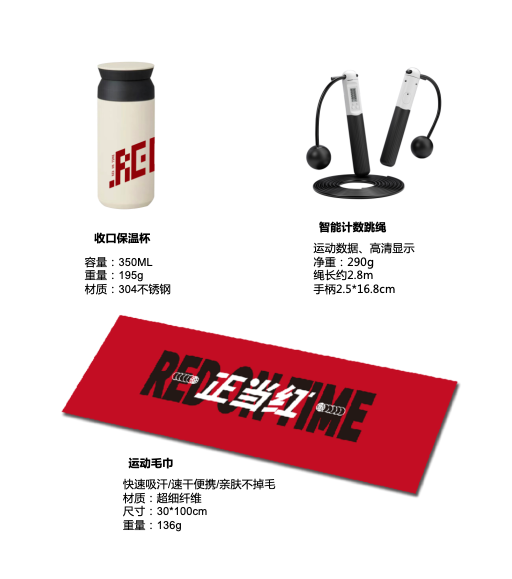• 正當(dāng)紅健身包運(yùn)動(dòng)毛巾保溫杯數(shù)顯跳繩