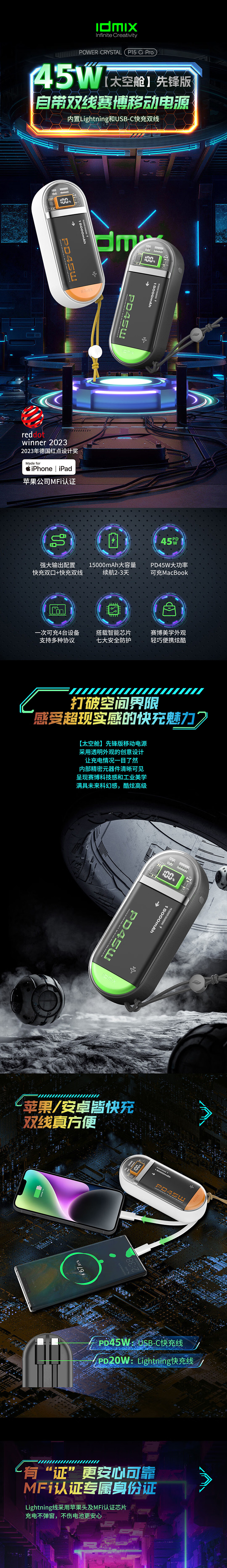 IDMIX 充電寶自帶雙線PD45W快充15000毫安時(shí)MFi認(rèn)證適用于蘋(píng)果華為Mate60Pro小米手機(jī)平板筆記本電腦